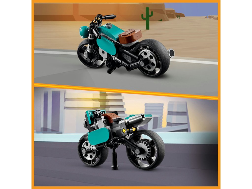 Se stavebnicí 3 v 1 si fandové LEGO mohou vybrat ze 3 různých stavitelských a herních zážitků. Mohou si postavit úchvatnou retro motorku a pak ji předělat na pouliční motorku se stojanem k vystavení nebo na dragster, který se účastní vzrušujících závodů – nebo zapojí svou představivost a postaví si z kostek něco zcela svého.