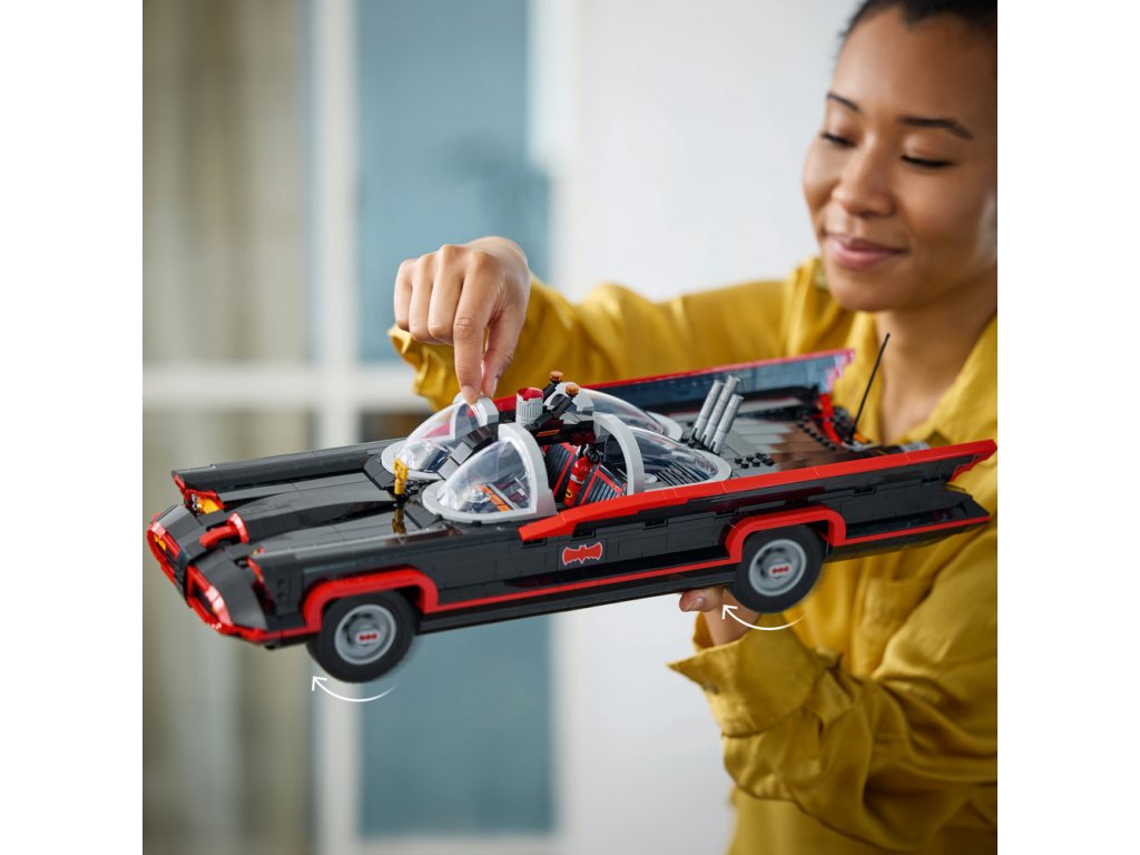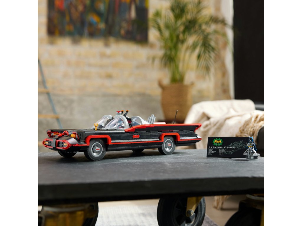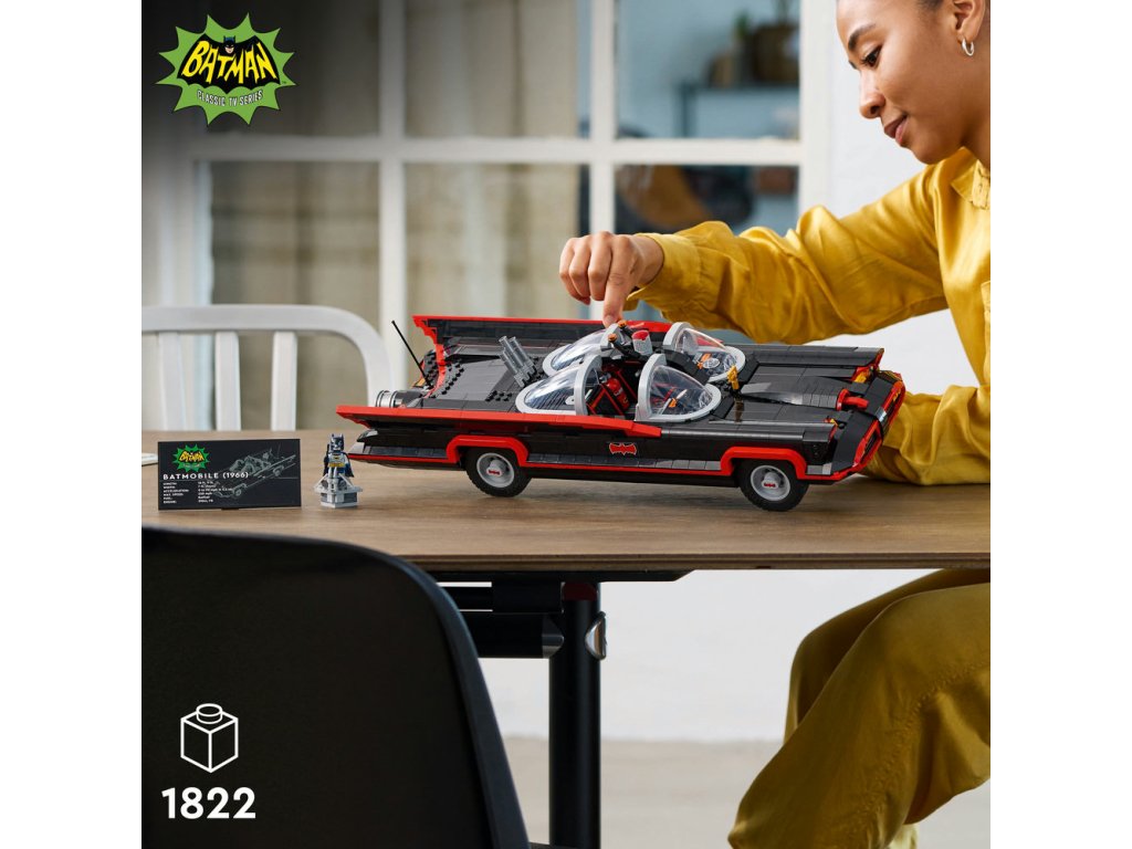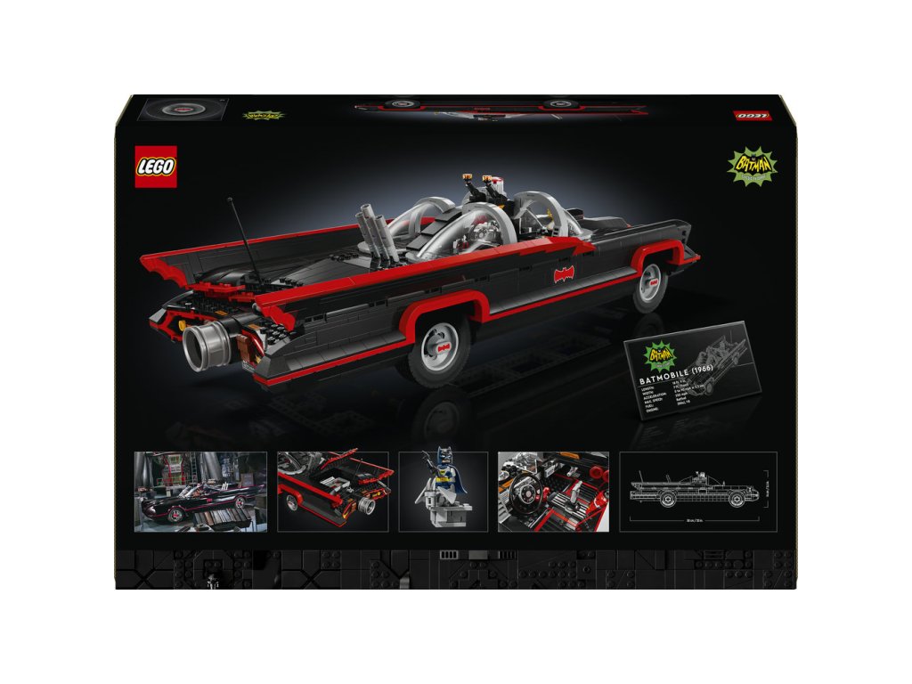 Tento poutavý sběratelský kousek DC Super Heroes™ je inspirován slavným Batmobilem z televizního seriálu z roku 1966. Vozidlo má tvarované čelní sklo, otočná kola, autentické dekorace a otevírací kufr s Batpočítačem. Minifigurka Batmana ve stylu roku 1966 na sobě má svůj charakteristický plášť a kápi, drží Batarang™ a stojí na plošině (minifigurka se do auta nevejde). Aplikace LEGO Builder obsahuje digitální verzi návodu na stavění, který je součástí stavebnice.