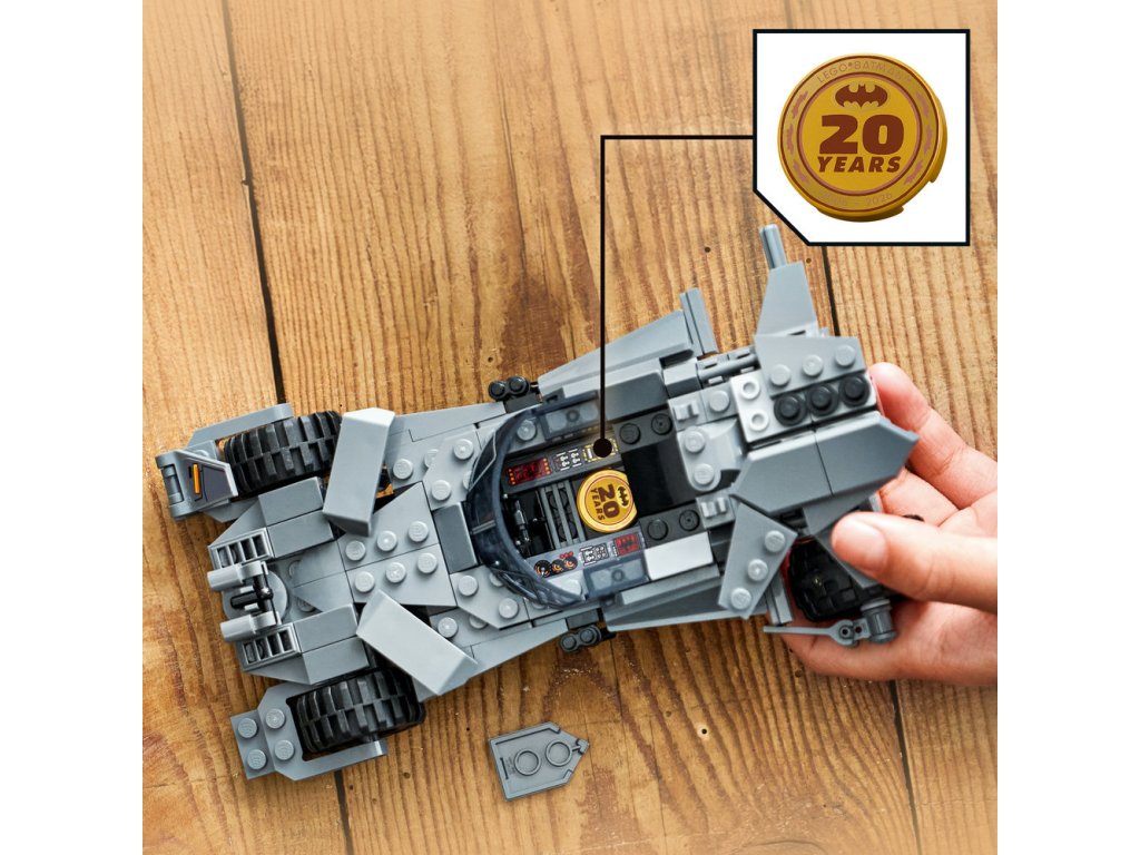 • MINIFIGURKA OBRNĚNÉHO BATMANA – Součástí balení je památeční minifigurka obrněného Batmana s látkovým pláštěm a památeční zlatá mince zabudovaná do kokpitu Batmobilu