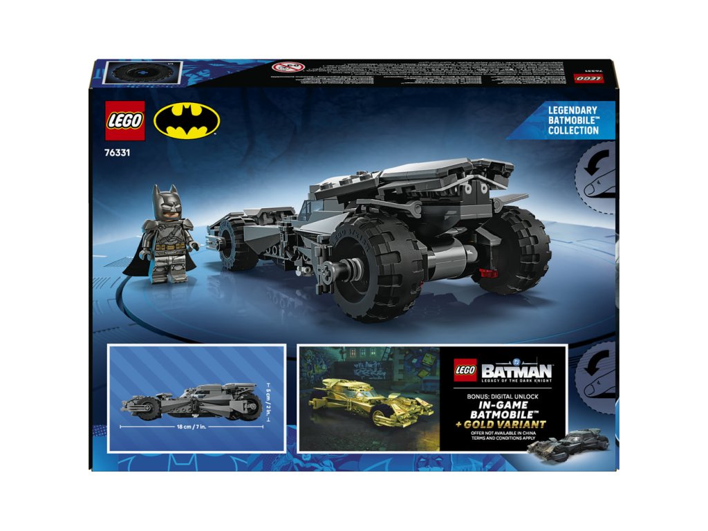 Připojte se k Batmanovi a zažijte akční superhrdinská dobrodružství se stavebnicí Batman vs. Superman™: Batmobil (76331), která bude skvělým dárkem pro kluky i holky od 9 let. Na oslavu 20. výročí řady LEGO® DC Batman přinášíme tuto sběratelskou stavebnici, ve které najdete slavné auto a minifigurku obrněného Batmana s látkovým pláštěm. Stavebnice Batmanova Batmobilu obsahuje přední nefunkční vystřelovač, otevírací kokpit a přední světla znázorněná grafickými samolepkami. Do interiéru vozu je zabudována pamětní zlatá mince. Minifigurku Batmana lze posadit do kokpitu vozidla. A aplikace LEGO Builder dodává dětem při stavění jistotu – můžou přibližovat a otáčet modely ve 3D a sledovat postup pomocí srozumitelného digitálního návodu. Stavebnice obsahuje 220 dílků. Bonus: Odemkněte digitálně: Získejte Batmobil inspirovaný filmem Batman v Superman a zlatou variantu Batmobilu ve videohře LEGO Batman – Legacy of the Dark Knight™. Naskenujte QR kód v návodu na stavění a postupujte podle pokynů.