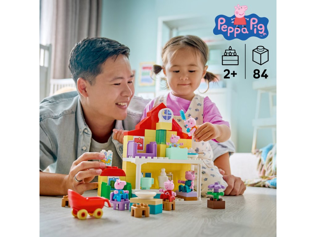 Batolata si můžou hrát na každodenní činnosti se svými oblíbenými televizními postavičkami se stavebnicí Prasátko Peppa Rodinný dům (10467). Tento dárek pro děti od 2 let obsahuje celou pětičlennou rodinu Prasátka Peppy, včetně prasátka Evie. Stejně jako v seriálu má i tento dvoupatrový domeček LEGO® DUPLO® oddělené pokoje pro Toma a Prasátko Peppu, kuchyň, koupelnu a obývací pokoj. S touto hračkou na hraní rolí si malé děti připomenou scény ze seriálu a zahrají na každodenní situace známé z vlastního domova, jako je uspávání nebo rodinná snídaně. Stavebnice obsahuje 5 figurek LEGO DUPLO – maminku, tatínka, Toma, Evie a Peppu – a pomáhá dětem rozvíjet emoční inteligenci při hraní na to, že mají nového člena rodiny. Tato vzdělávací hračka pro batolata je plná doplňků pro hru plnou kreativity a umožňuje malým stavitelům představit si péči o miminko včetně procházky v kočárku, krmení z láhve nebo koupání. Stavebnice obsahuje 84 dílků.