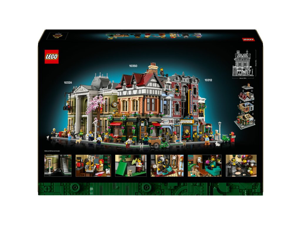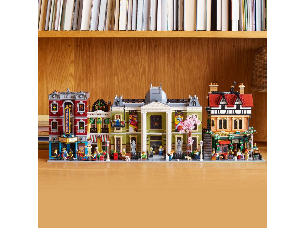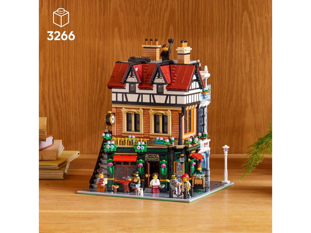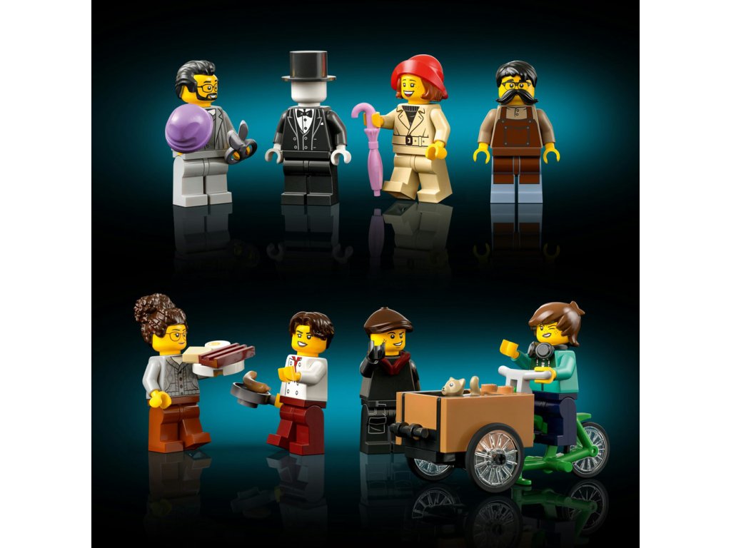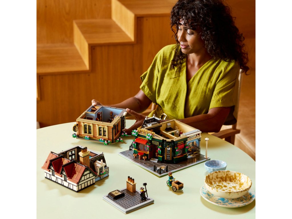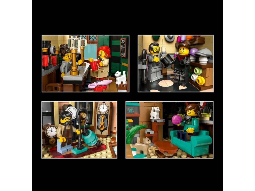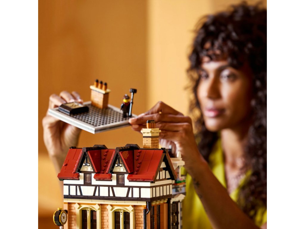 Součástí stavebnice jsou 3 fasády v cihlovém a dřevěném stylu doplněné řadou oken, venkovní schodiště a strmá červená střecha s rustikálními komíny. V interiéru najdete restauraci s pultem, stoličkami a stolem, galanterii s klobouky a deštníky, hodinářskou dílnu s nočním stolkem a stojacími hodinami a útulný podkrovní byt. Tato ozdobná stavebnice se bude skvěle vyjímat v kanceláři nebo doma a součástí je 8 minifigurek. Modulární design budovy vám umožní přeuspořádat jednotlivé místnosti a nabízí nekonečné možnosti vystavování a vyprávění příběhů.