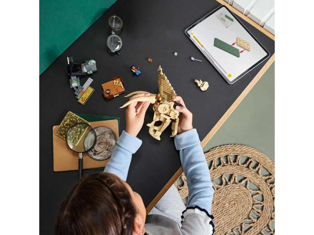 • Lebka triceratopse, minifigurka a deska naleziště s minizkamenělinami a nástroji