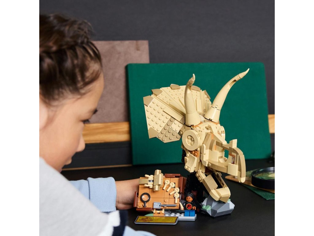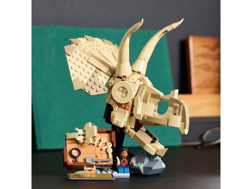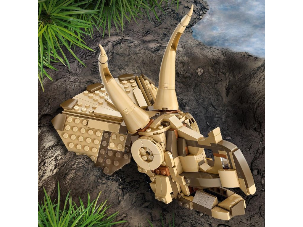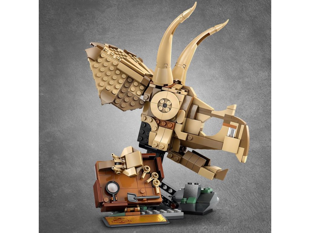 Malí paleontologové od 9 let si vychutnají hru na sbírání dinosauřích fosilií se stavebnicí LEGO® Jurassic World (76969) Dinosauří fosilie: Lebka triceratopse na motivy filmu Jurský svět. Tento model z výstavní série Dinosauří fosilie obsahuje lebku Triceratopse s otevírací čelistí, podstavec se skalní podložkou, destičku místa naleziště s minizkamenělinami a nástroji na vykopávání, minifigurku LEGO, informační cedulku a „jantarový“ dílek s uvězněným komárem.