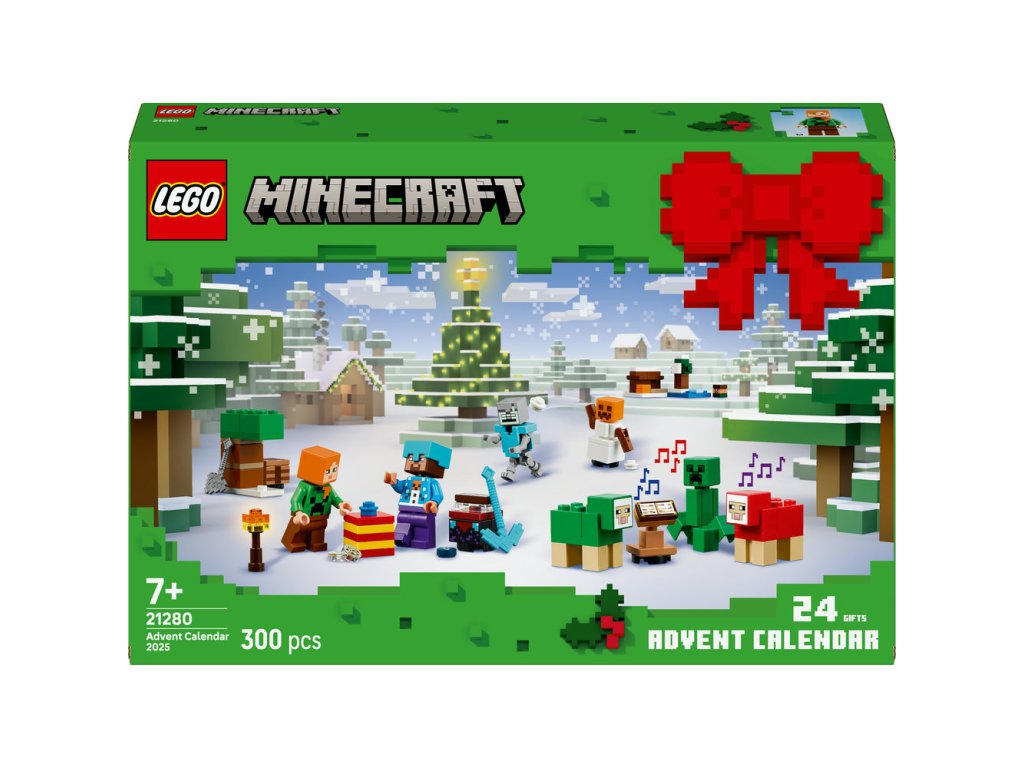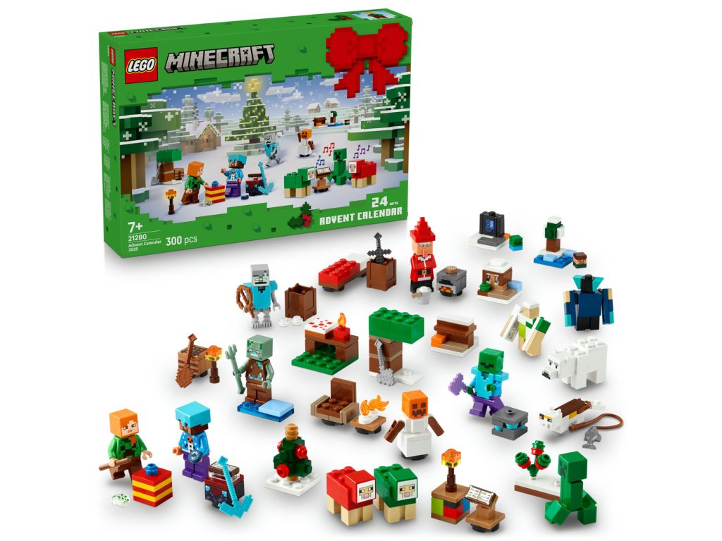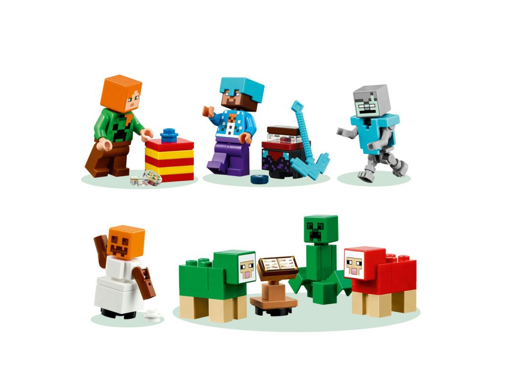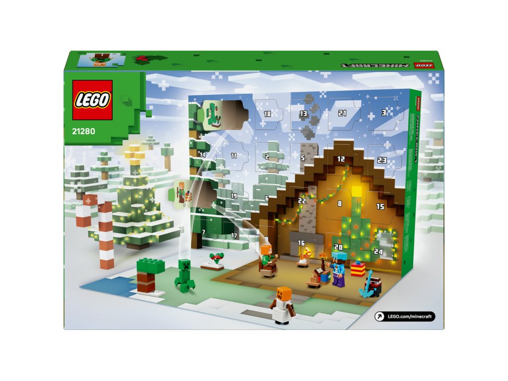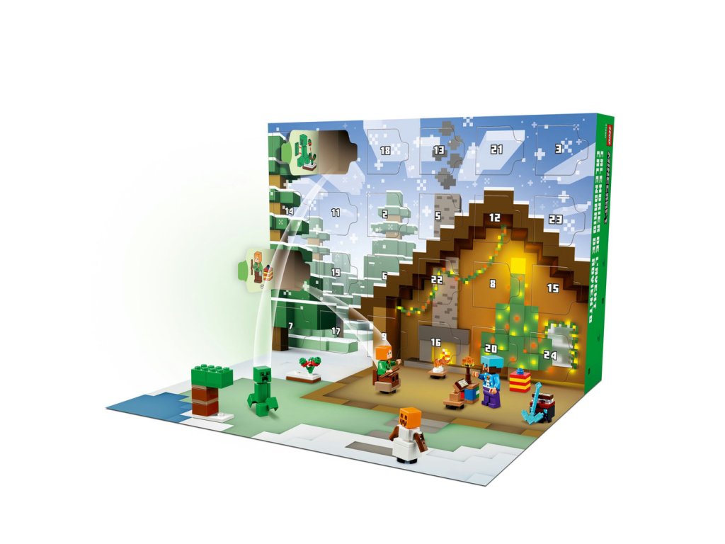 Za každým z 24 okének se skrývá jeden dáreček pro děti. Mezi minifigurkami najdete Alex ve svetru s motivem Creepera, Stevea ve svetru s motivem sněhuláka, diamantové helmě a s krumpáčem v ruce, Creepera u keře s bobulemi, utopence s trojzubcem, bludného kostlivce s diamantovou zbrojí, sněžného golema, zombie s očarovanou sekerou a vesničana Santu s pecí. Součástí je také spousta miniaturních modelů a parádních doplňků, které děti dobře znají ze své oblíbené hry. S blížícími se Vánocemi děti můžou jednotlivé dárečky kombinovat a vytvořit si mikro model zimní vesničky Minecraft plný nápaditých dobrodružství. Součástí stavebnice je navíc rozkládací hrací podložka, která poslouží jako dokonalé pozadí.
