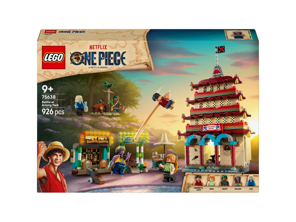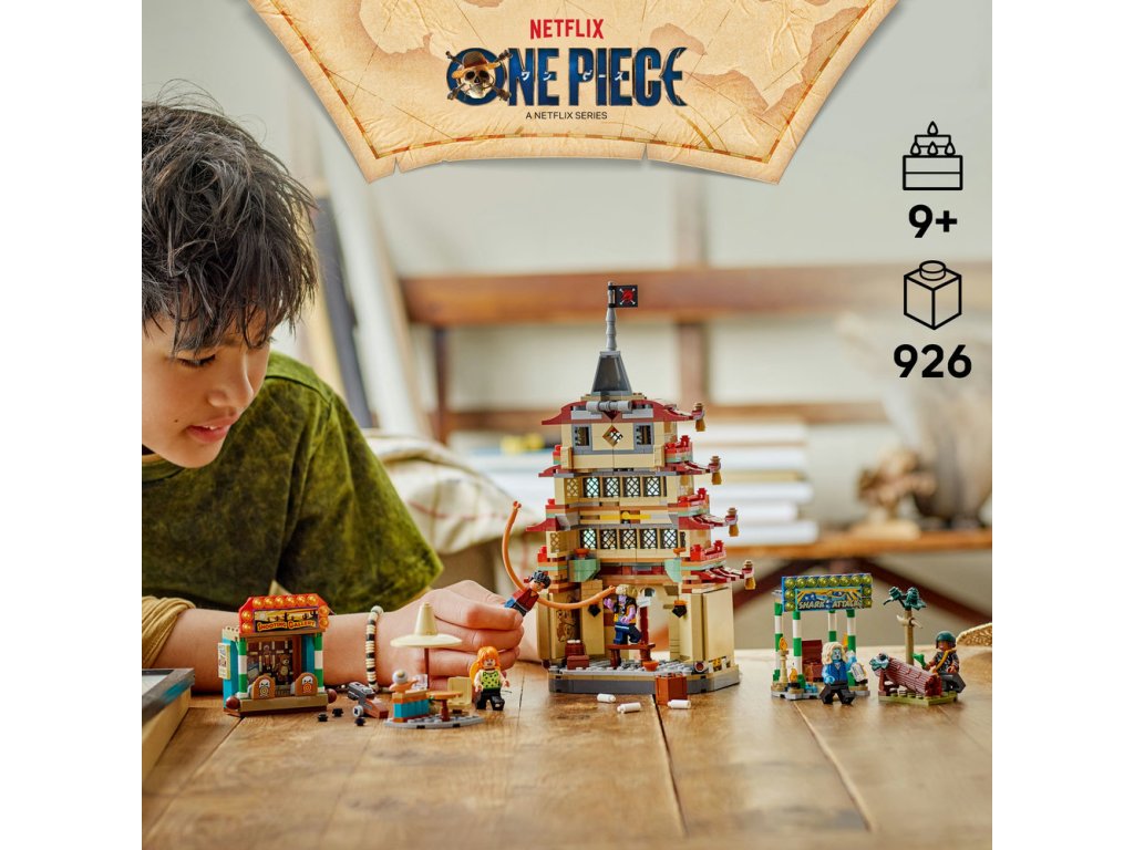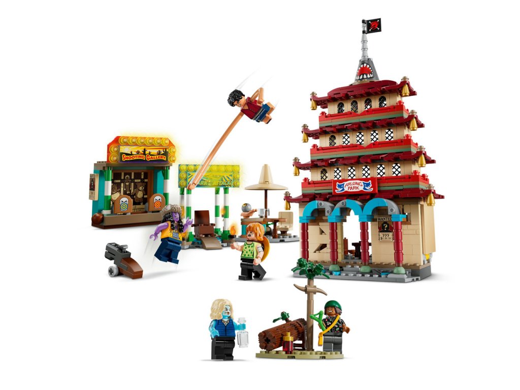 Součástí stavebnice je minifigurka Luffyho, která obsahuje také dílky na prodloužení paží, Nami, Usoppa, Arlonga a Chua. Děti můžou model pagody během bitvy vyhodit do povětří poklepáním na střechu. Na střelnici najdete zábavné terče, na které děti mohou mířit vystřelovači. Usaďte zlotřilého Arlonga na trůn v budově žraločího útoku. Chu se může napít v chatrči a v lese najdete láhev kečupu. Stavebnice obsahuje také vystřelovače a doplňky, včetně 3 plakátů hledaných osob. Pro ještě větší porci digitální zábavy můžou stavitelé přibližovat a otáčet modely ve 3D a sledovat postup stavění pomocí intuitivní aplikace LEGO Builder. Stavebnice obsahuje 926 dílků.