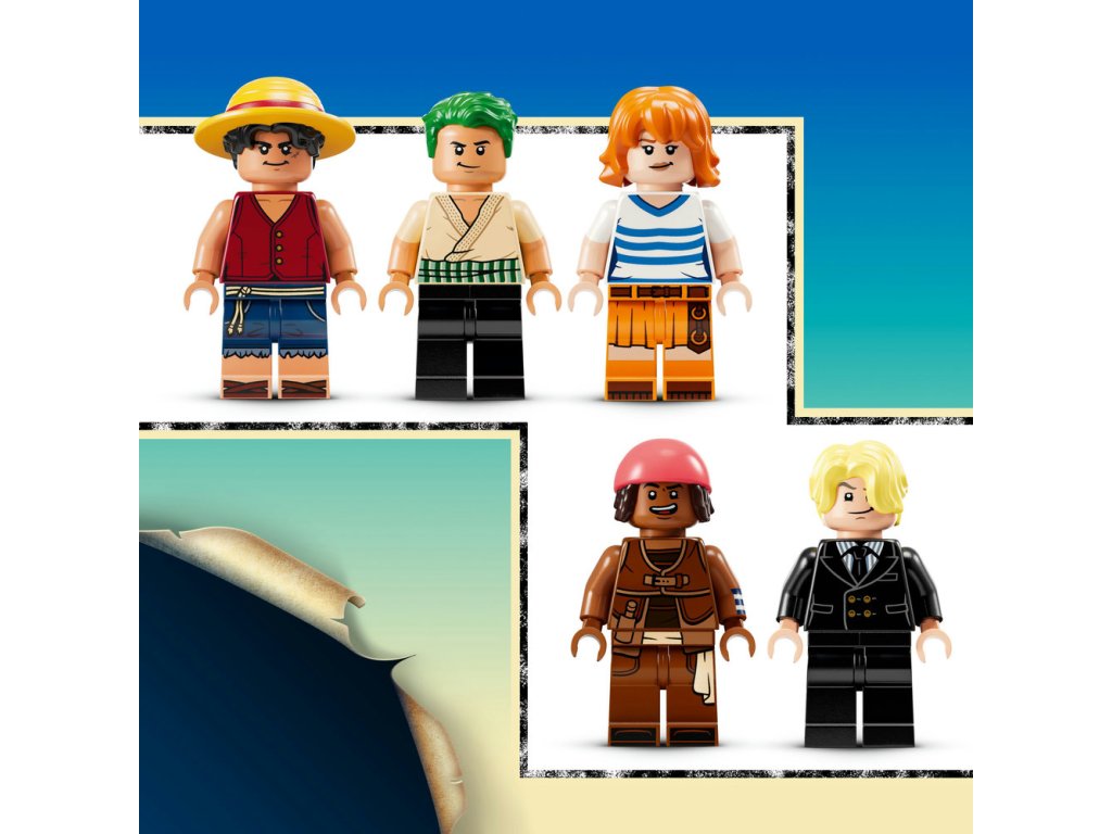 Tato ikonická loď má hned několik vnitřních prostor: kajutu pro posádku, kuchyň, sklad a dílnu na příslušenství. Součástí modelu je 5 minifigurek LEGO ONE PIECE. Luffy sedí na figuře ovce na přídi lodi, pod kterou je dělo, Zoro odpočívá a trénuje na palubě, Nami ovládá kormidlo, zatímco na zadní palubě rostou její oblíbené mandarinky, Usopp šplhá po stěžních a drží stráž a Sanji nese hrnce dolů po schodech do kuchyně. Nechybí 4 plakáty s hledanými osobami. Aplikace LEGO Builder umožňuje dětem přibližovat a otáčet modely ve 3D a sledovat pokrok. Stavebnice obsahuje 1376 dílků.
