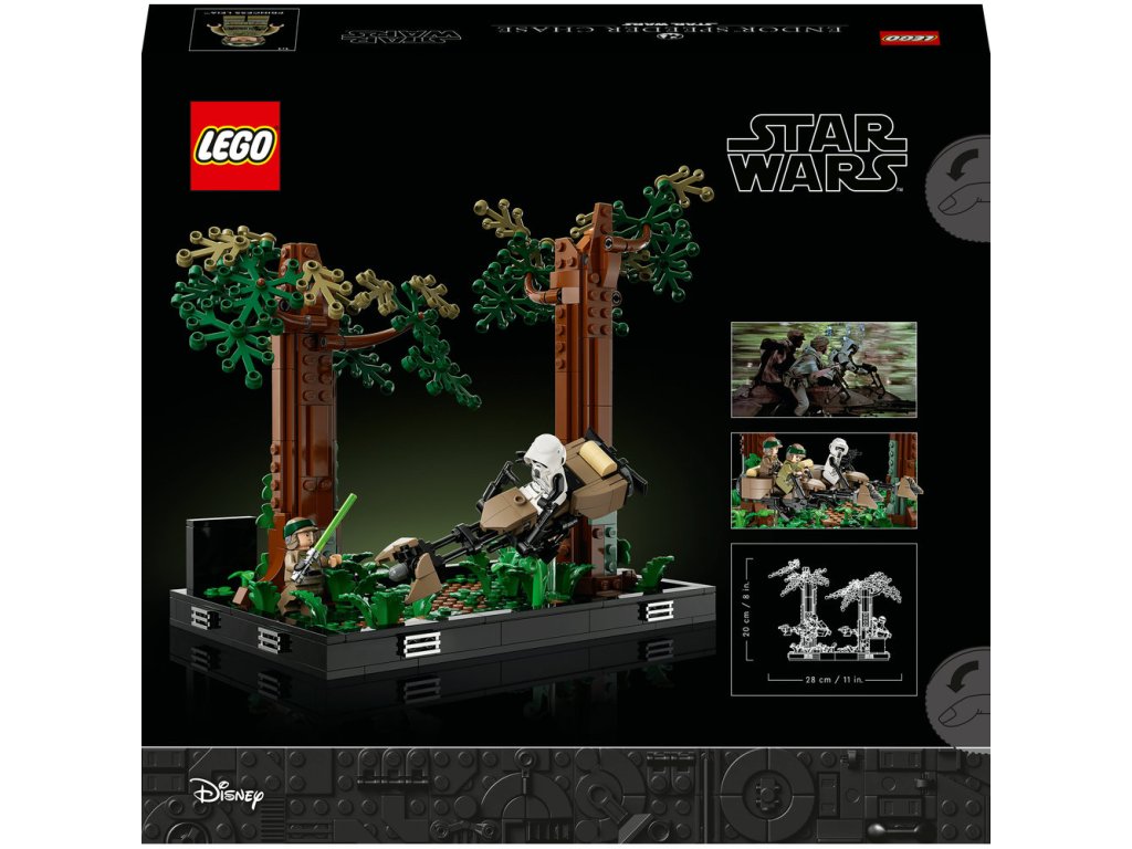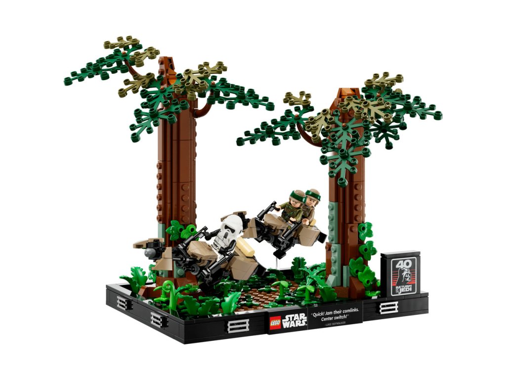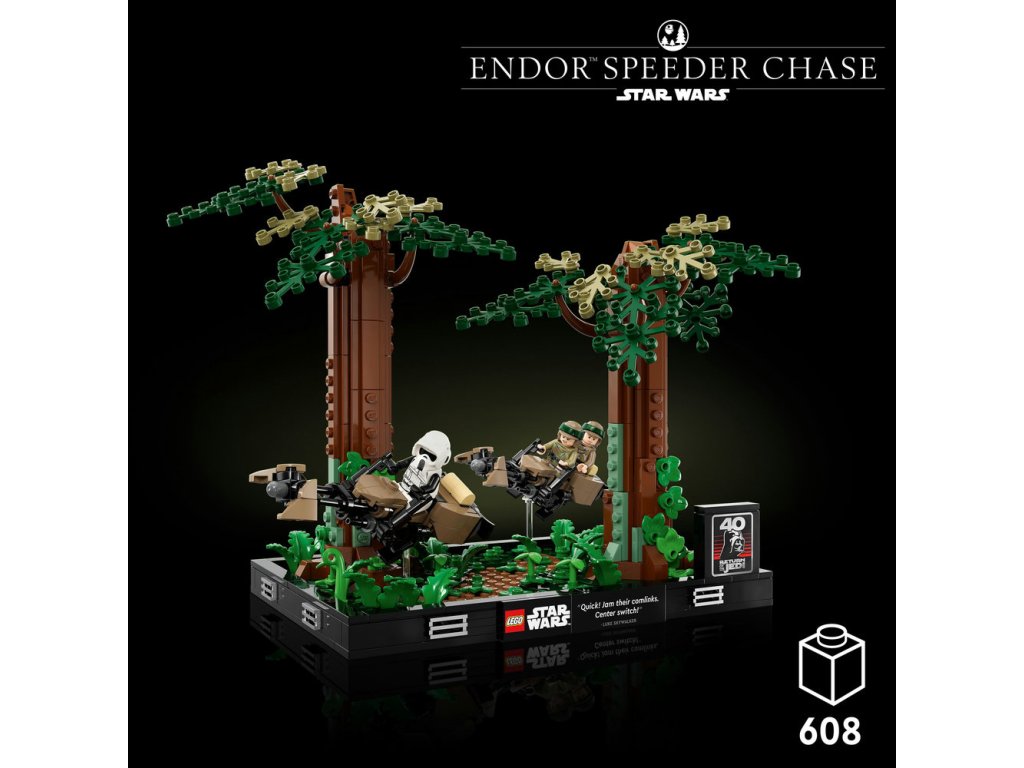 Zachyťte dynamickou akci vzrušující scény z filmu Star Wars: Návrat Jediho se stavebnicí Honička spídrů na planetě Endor™ – diorama (75353). Součástí stavebnice jsou 3 minifigurky LEGO (princezna Leia, Luke Skywalker a průzkumný voják), 2 spídrové motorky s průhlednými prvky, díky nimž je lze v lesích Endoru libovolně pózovat tak, aby vypadaly, že skutečně letí, 2 sestavitelné stromy a prvky kapradin, které jsou novinkou pro květen 2023. Výstavní model dokončíte plaketkou s hláškou Luka Skywalkera („Quick! Jam their comlinks. Center switch!“) a plaketkou s logem ke 40. výročí filmu Star Wars: Návrat Jediho.