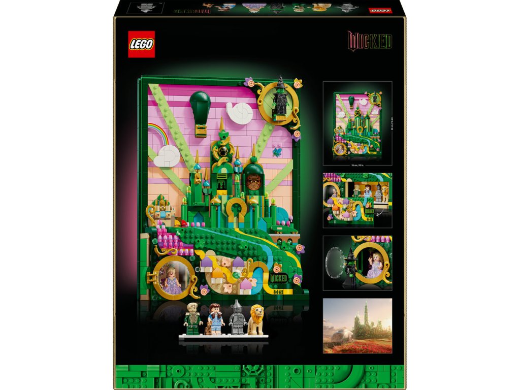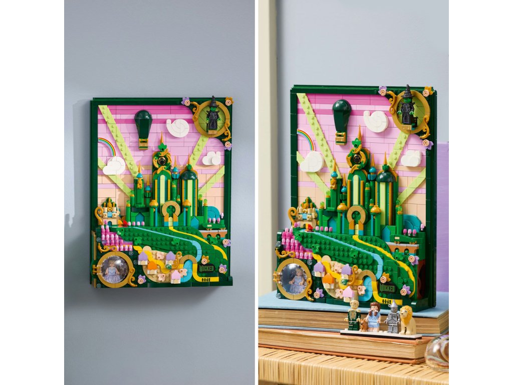 Tento umělecký dárek Wicked pro ženy, muže a dospělé fanoušky Wicked vdechne život filmovým momentům ve 3D podobě. V této pestrobarevné dekoraci najdete klíčová místa z filmu, včetně univerzity Shiz, Munchkinlandu a města Emerald City. Součástí je také Glindina bublina, kouzelný les a tajná schránka, ve které se ukrývají 4 postavy – minifigurky LEGO Dorothy Gale, Cowardly Liona, Scarecrowa a Tin Mana a řada dalších skrytých odkazů na film, které můžete objevit.